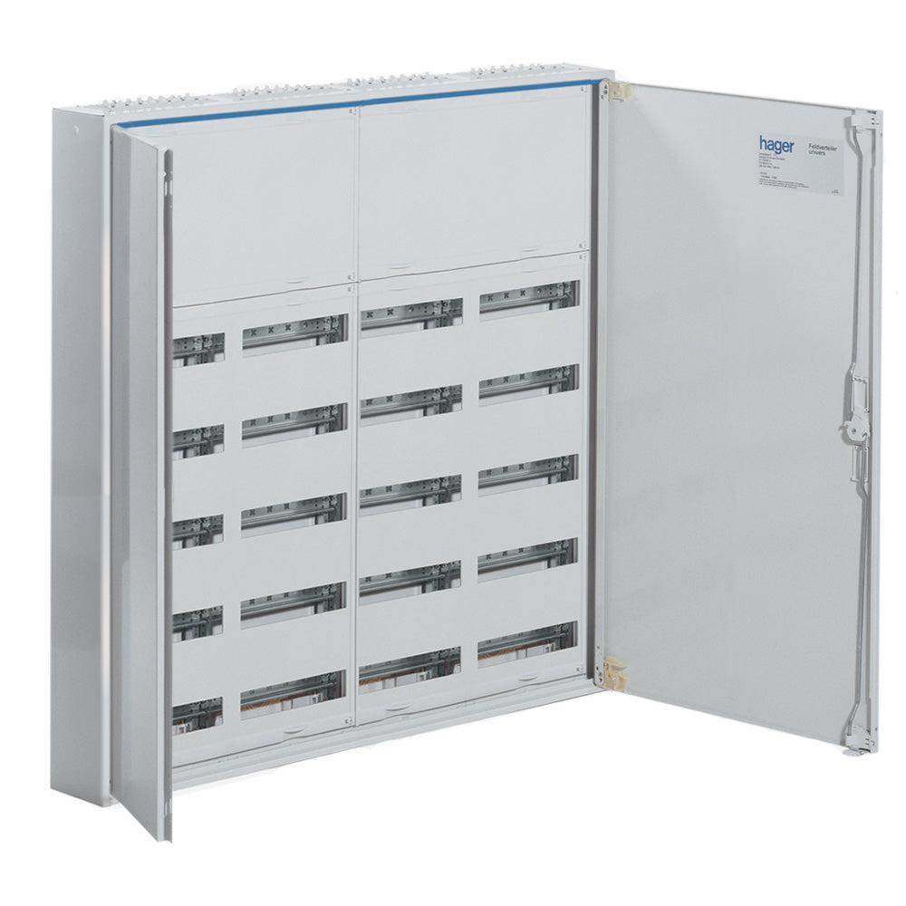 Hager Veldverdelers Opbouw groepenkast, leeg, wit, (bxhxd) 1050x1100x161mm, breedte in module-eenheden 48, beschermingsgraad (IP) IP44, 7 rijen, behuizing staal, opbouw, soort afdekking deksel, uitvoering deksel met uitsparing, aanbouwmogelijkheid, type sluiting overig, inbouwdiepte 161mm,